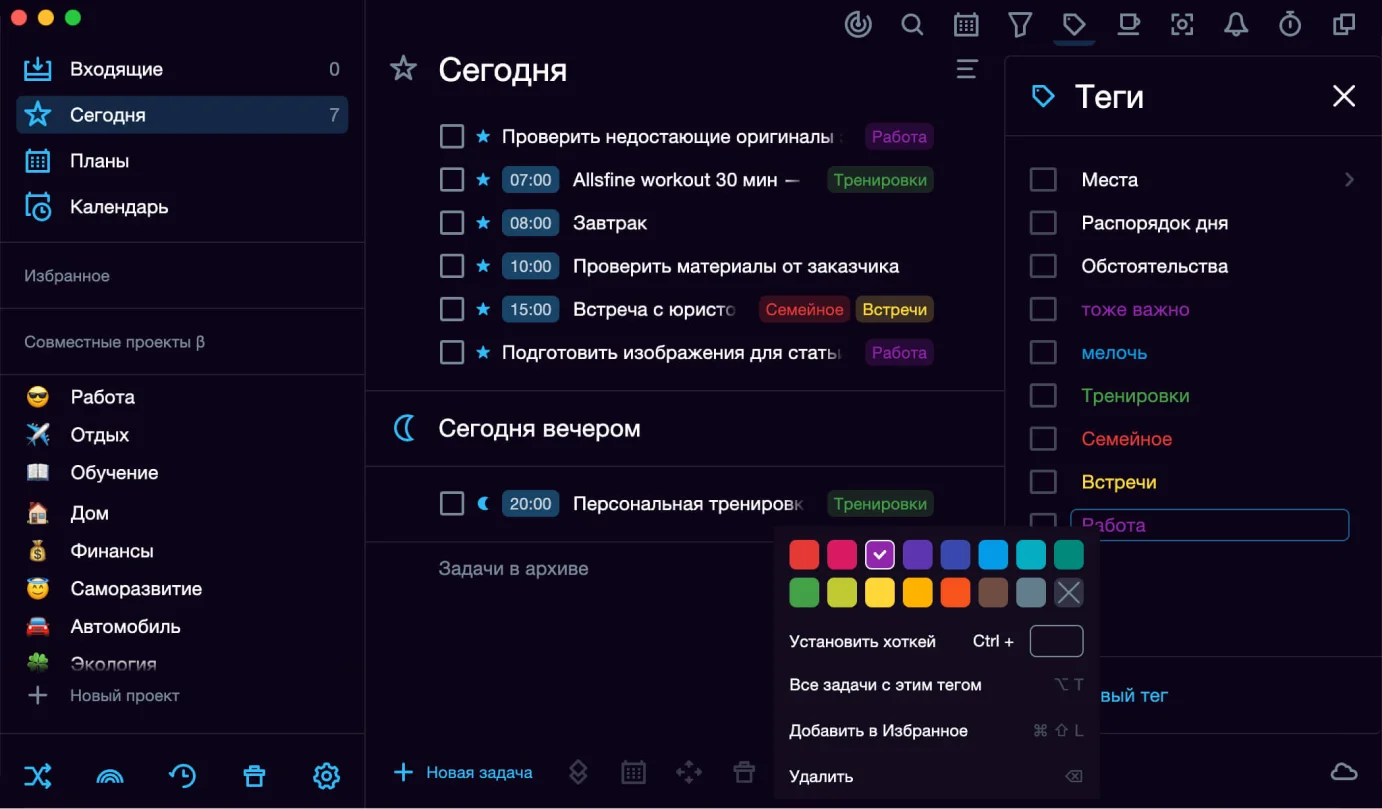 ✅ Бесконечная вложенность задач, тегов, проектов.