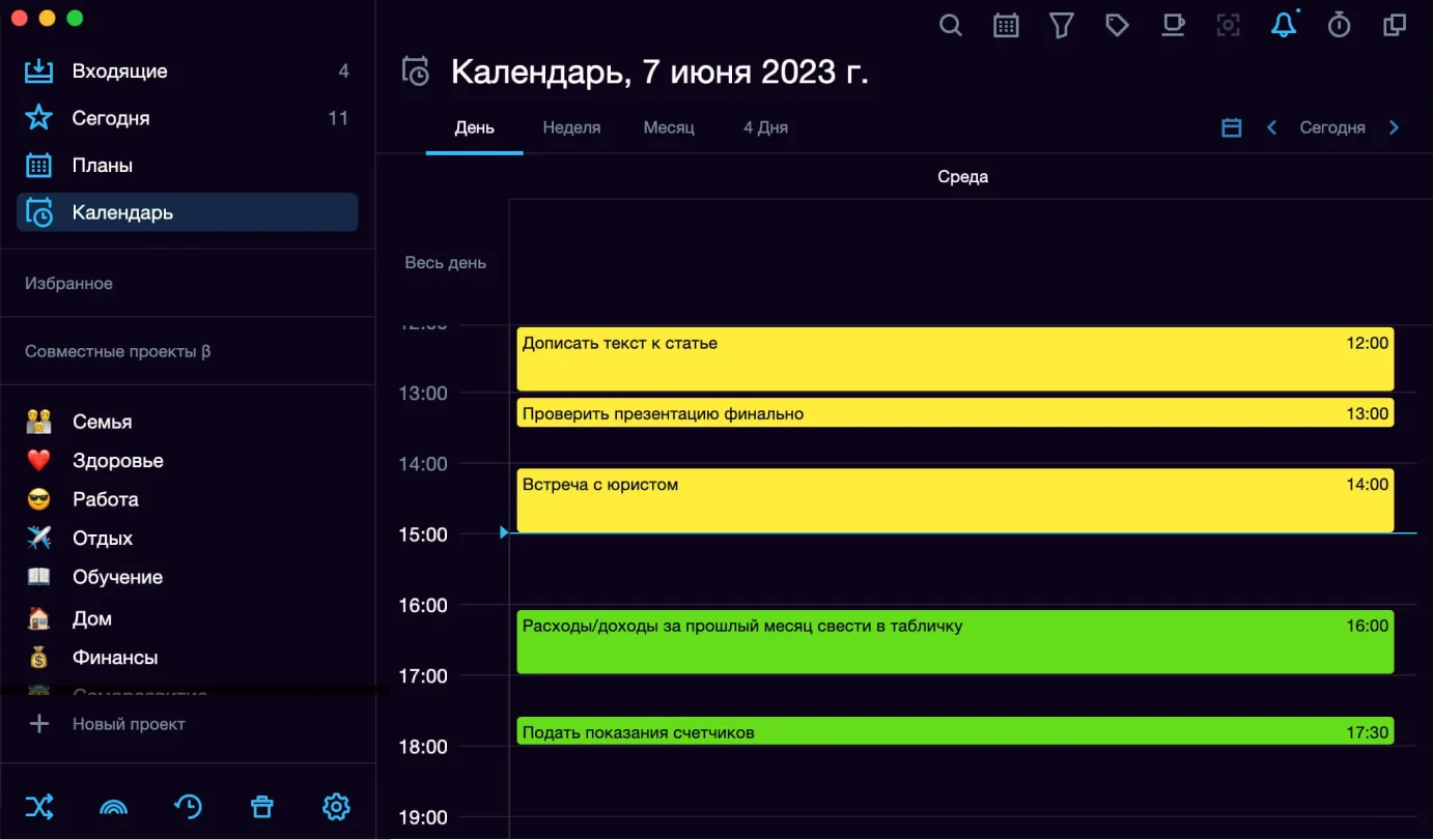 В этом онлайн-планировщике есть всё необходимое, чтобы в делах всегда был порядок — разнообразие способов ввода, бесконечная вложенность задач, чек-листы и многое другое. А дополнительные функции, например, таймер Помодоро и режим фокуса, помогут повысить продуктивность.