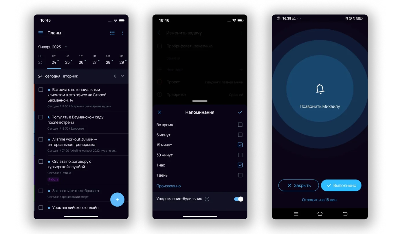 ⏰ Мощная система напоминаний: режим будильника и несколько уведомлений для каждой задачи.