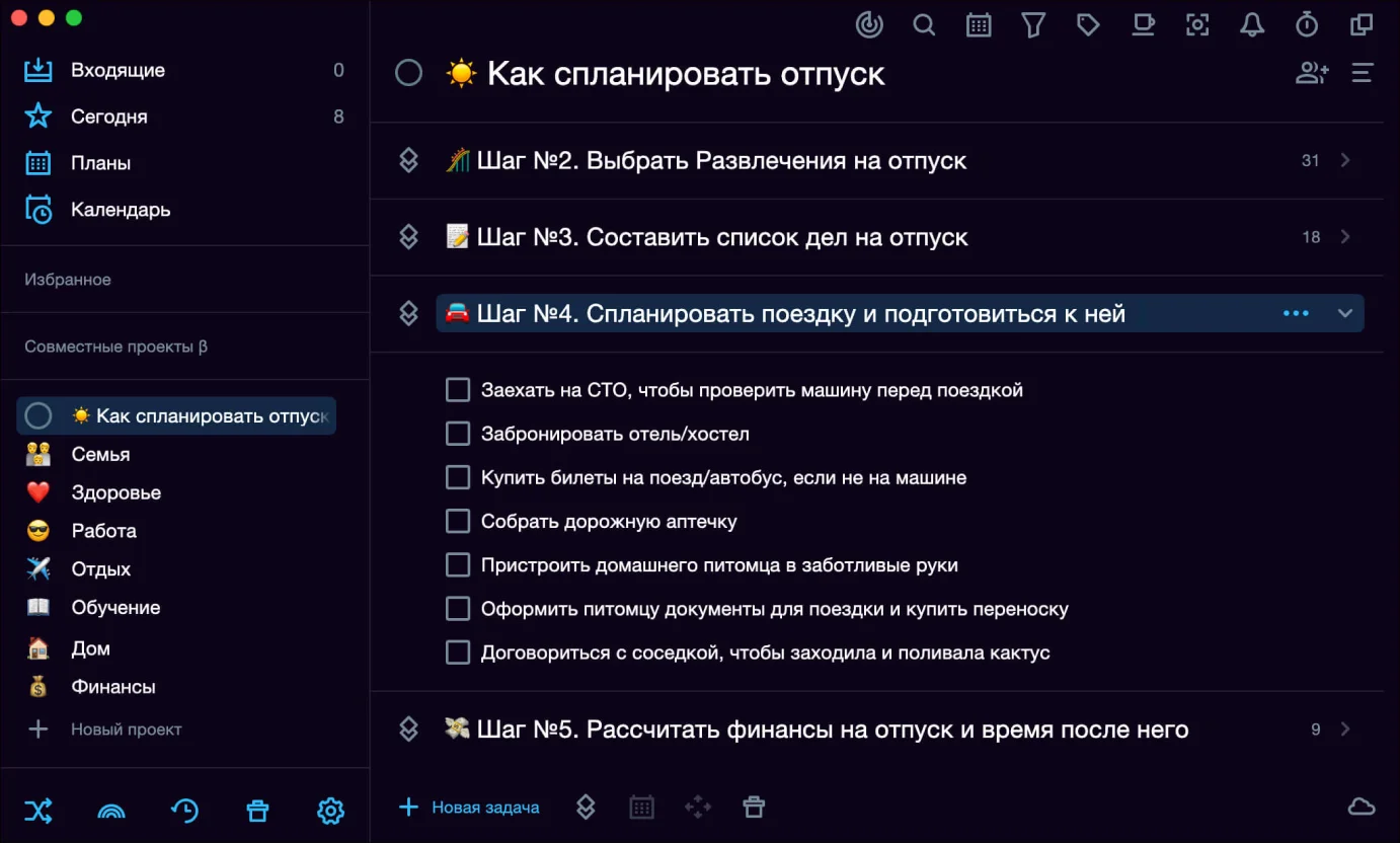 В этом онлайн-планировщике есть всё необходимое, чтобы в делах всегда был порядок — разнообразие способов ввода, бесконечная вложенность задач, чек-листы и многое другое. А дополнительные функции, например, таймер Помодоро и режим фокуса, помогут повысить продуктивность.