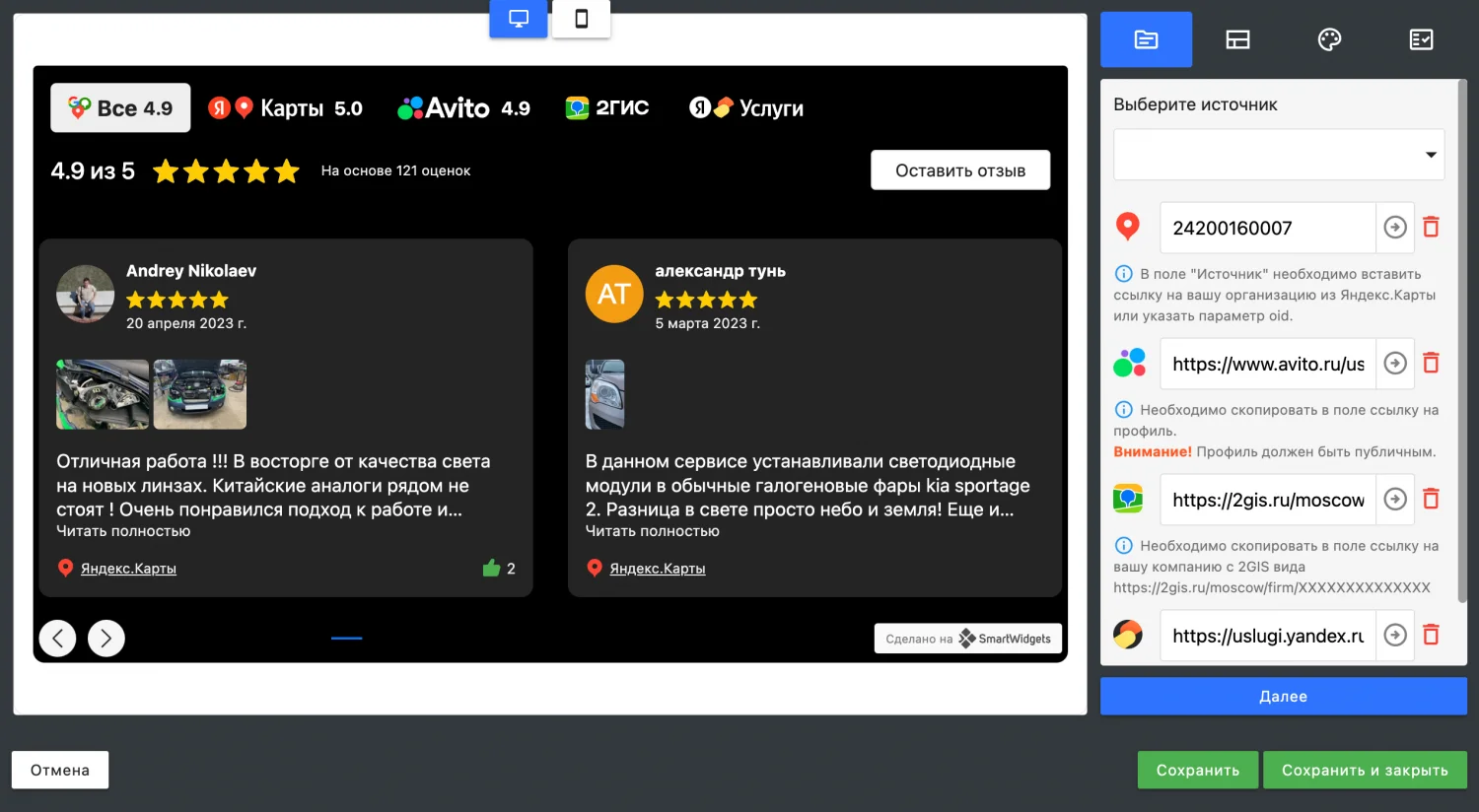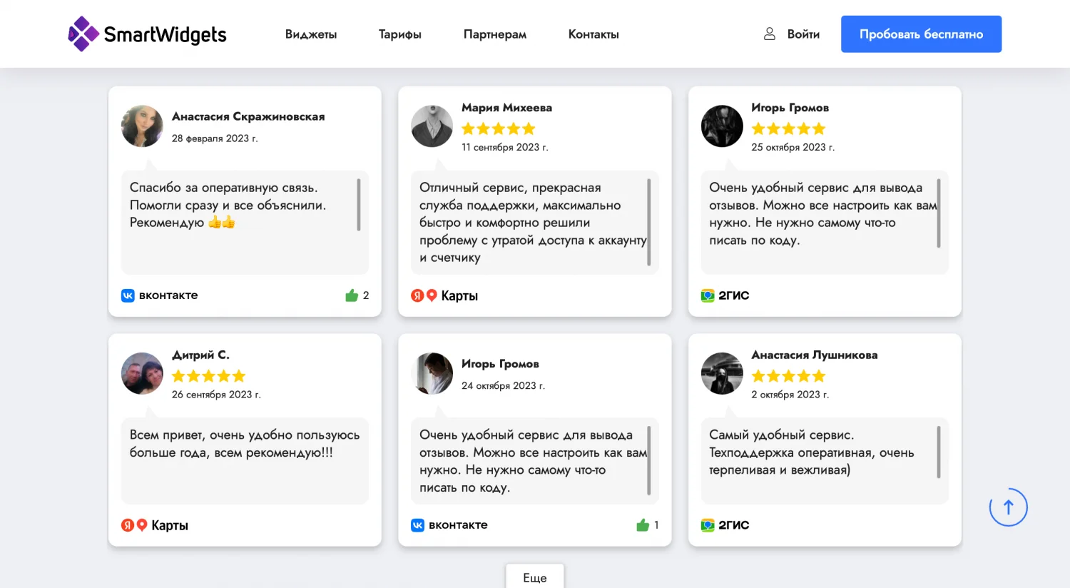 SmartWidgets отличный сервис по размещению отзывов с топовых отзовиков Рунета на сайте. Удобный по настройке, визуально можно подстроить под дизайн сайта, адекватная стоимость. Рекомендую!