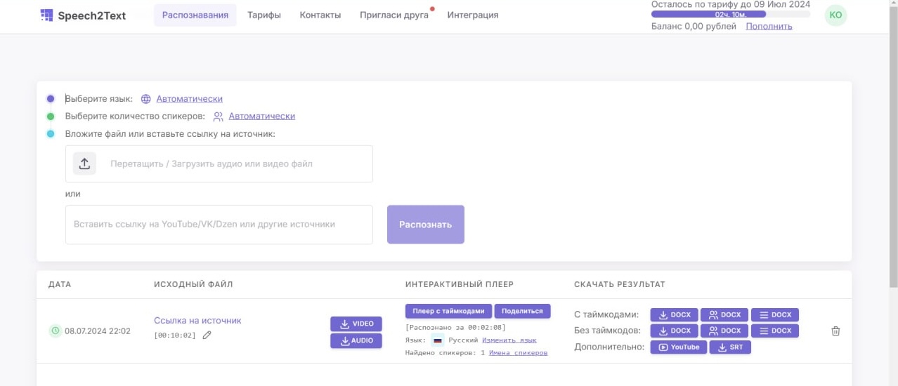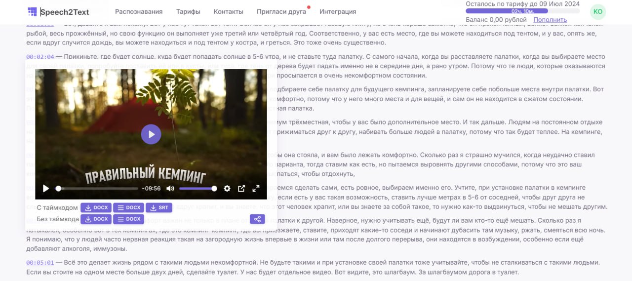 Сервис поддерживает множество языков и форматов аудио (mp3, ogg, wma и другие), видео (mp4, webm, mkv и прочие) и даже распознает текст по ссылке на YouTube, RuTube, VK и так далее. Расшифровка выполняется с помощью нейросетей, обеспечивая высокое качество. Все данные защищены, а результаты можно скачать в формате docx или в виде субтитров.