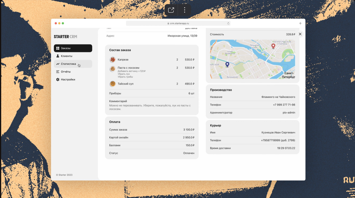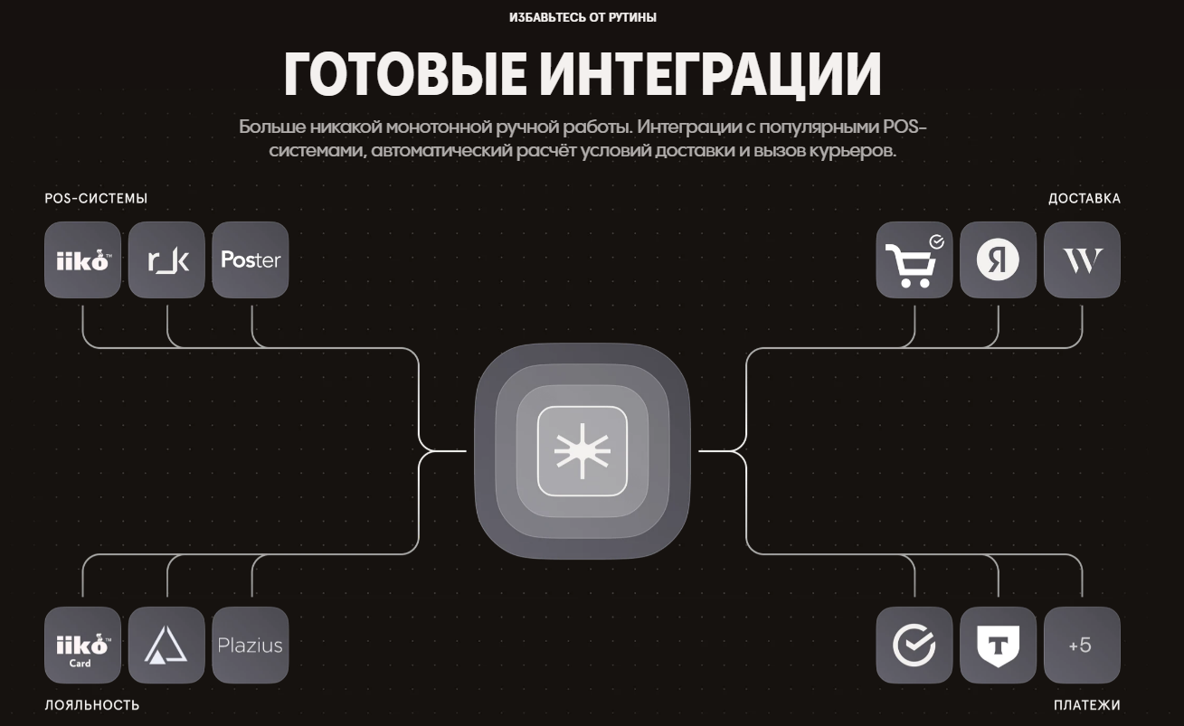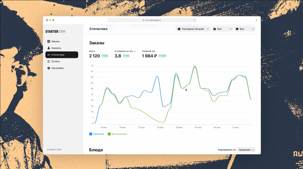 Внутренняя CRM поможет в управлении заказами и клиентской базой. Имеется большое количество аналитических отчётов для маркетолога, шеф-повара и руководителя.