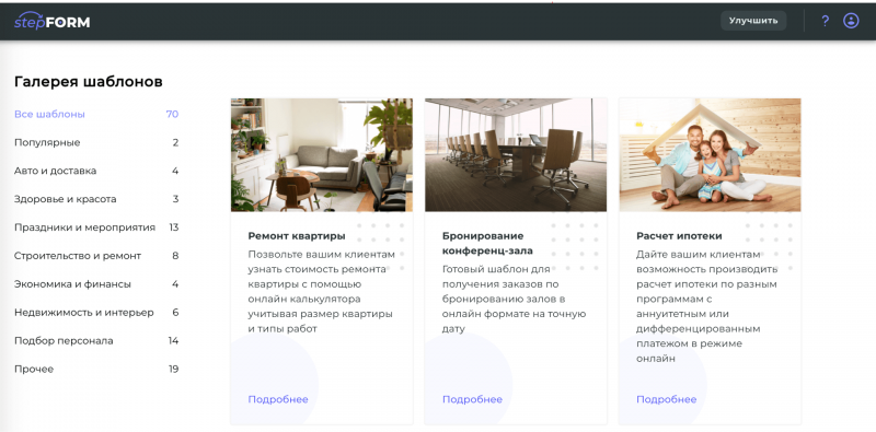 В первую очередь данный конструктор ориентирован на владельцев малого и среднего бизнеса, а также отлично подойдет для фрилансеров, но им могут пользоваться абсолютно все и для разных целей. Создать опрос, форму, калькулятор - все это можно в stepFORM.