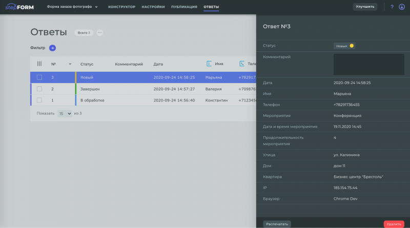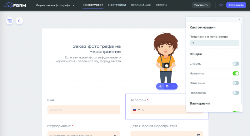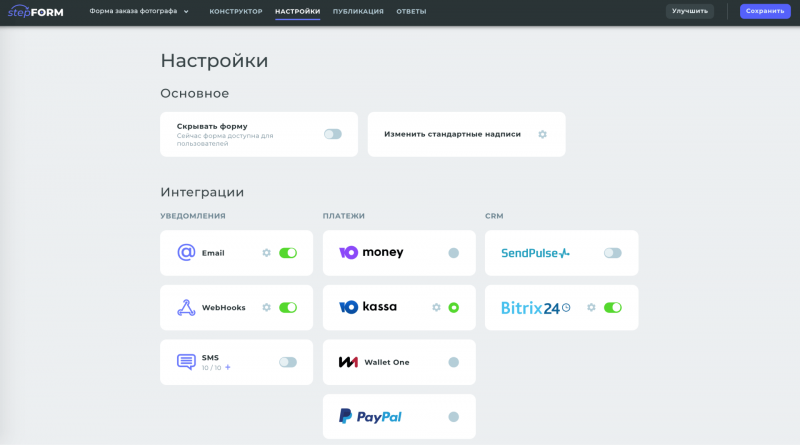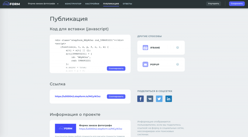 stepFORM - конструктор форм и опросов с возможностью их размещения на сайтах, в социальных сетях, мессенджерах и по прямой ссылке.