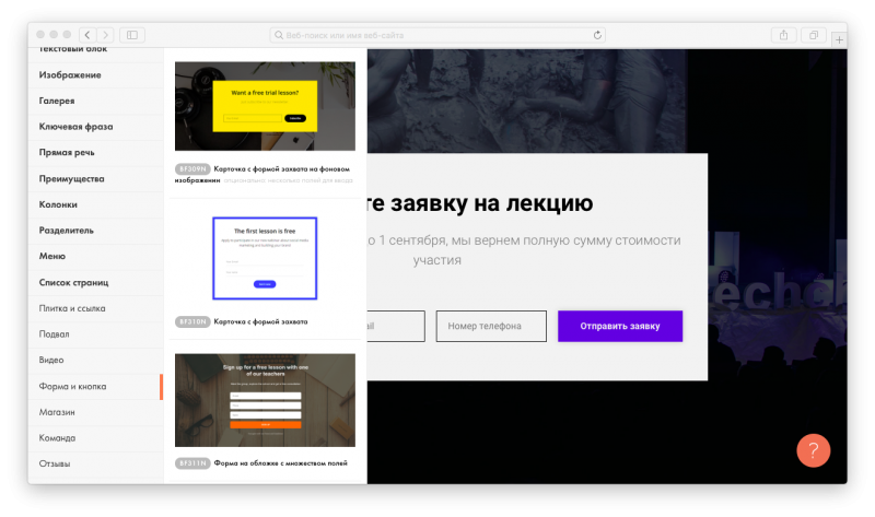 Главная особенность сервиса — блочный редактор. Страницы на Тильде можно собирать из блоков — библиотеке уже больше 500 готовых вариантов. Они разделены на 28 категорий: обложка, услуги, формы, отзывы, магазин, о компании и др. Все блоки спроектированы дизайнерами и имеют правильные отступы и соотношения размеров. Каждый блок адаптивен и автоматически подстраивается под экраны разных устройств. Текст и изображения можно менять прямо на странице в режиме редактирования.
