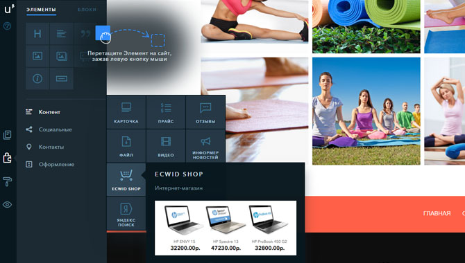 uKit — это сервис для создания коммерческих сайтов: визиток, магазинов (Ecwid Shop) и лэндингов. Оформление страниц происходит в качественном и удобном визуальном редакторе посредством перетаскивания на них виджетов (функциональных элементов). Последние имеют собственные настройки, которые разнятся в зависимости от их типа. Примеры виджетов: форма, плеер, социальная панель, карточка товара, прайс, слайдер, галерея и так далее.