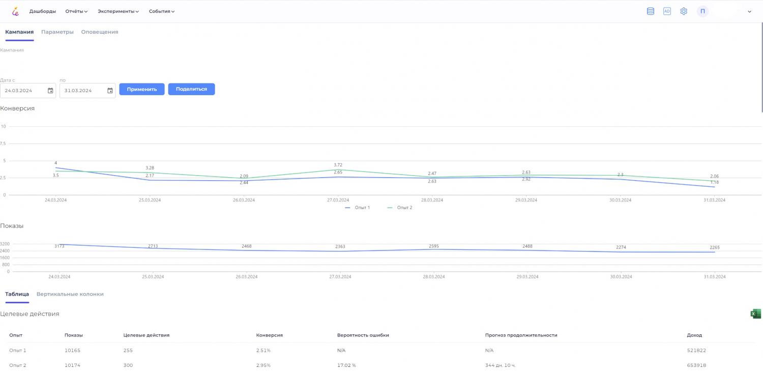 Для простых экспериментов есть функционал визуального редактора. Пользователям не нужно вручную рассчитывать сроки проведения эксперимента и выхода на достоверность – AI помощник cделает это автоматически.