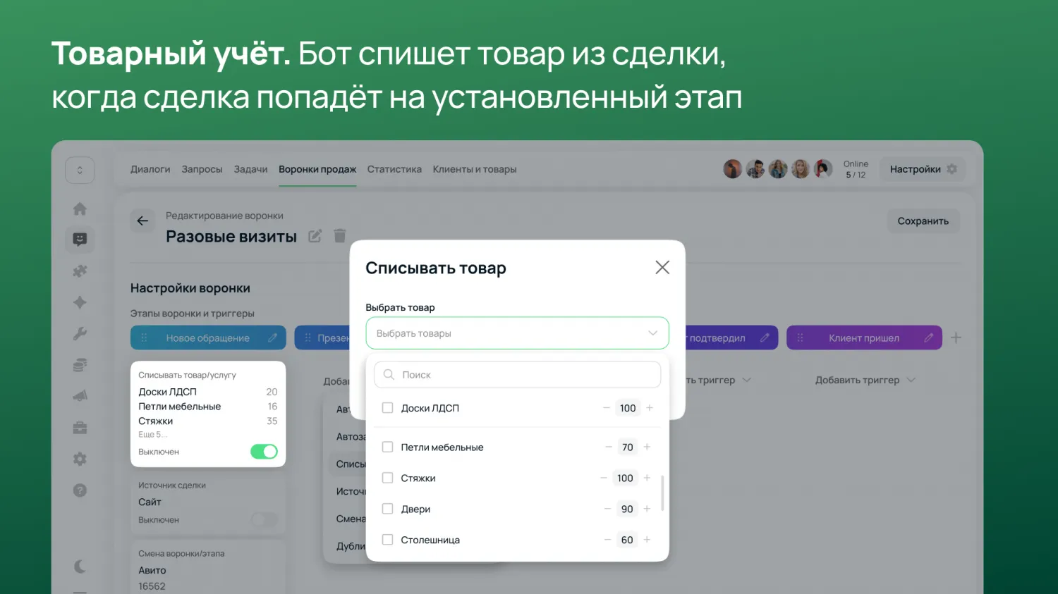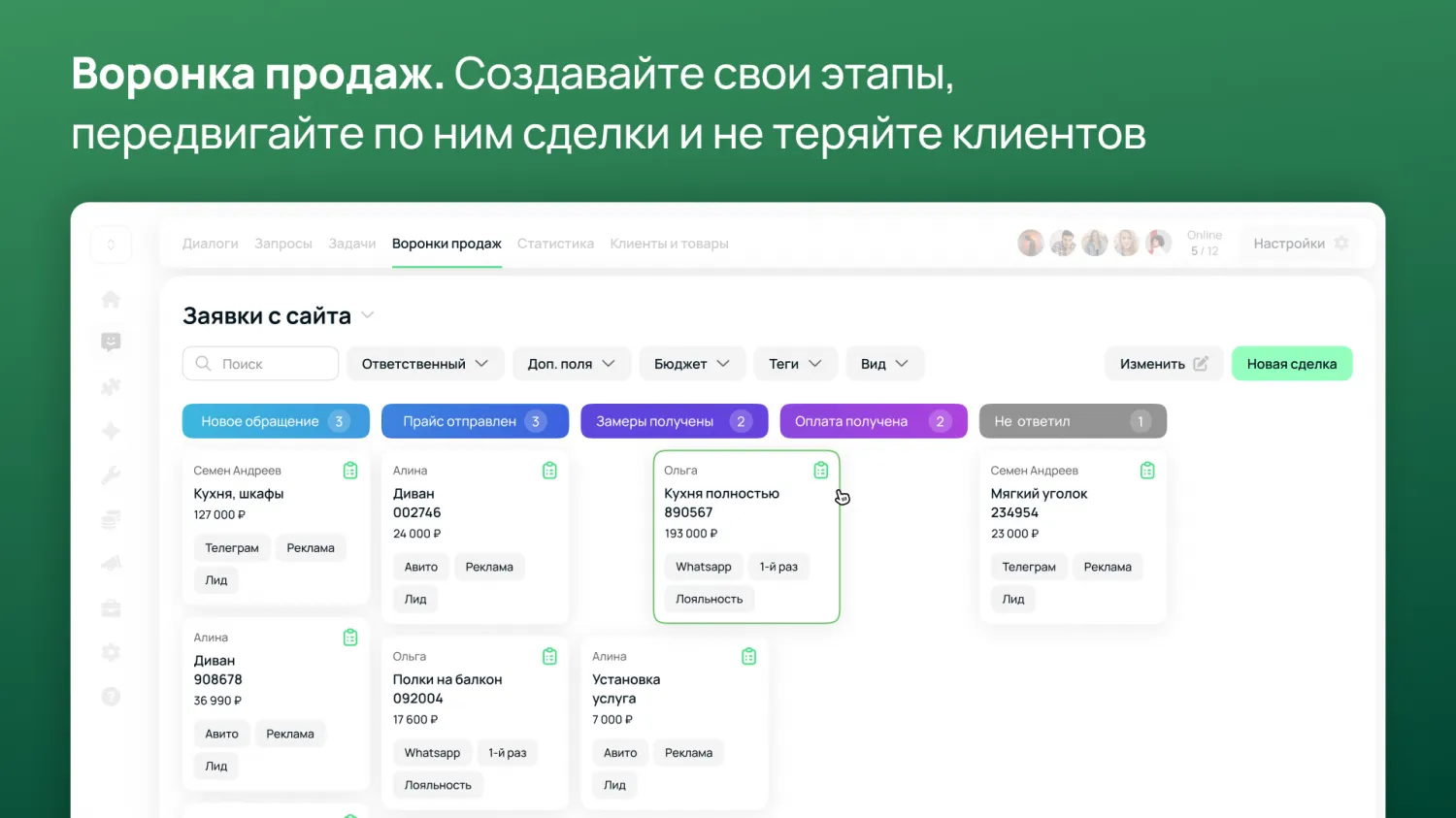 Ваша команда получает среду для работы, в которой удобно продавать — с коммуникацией, ведением до покупки и возвращением клиентов. А вы сможете контролировать менеджеров: отслеживать сделки, анализировать отказы, проверять переписки.