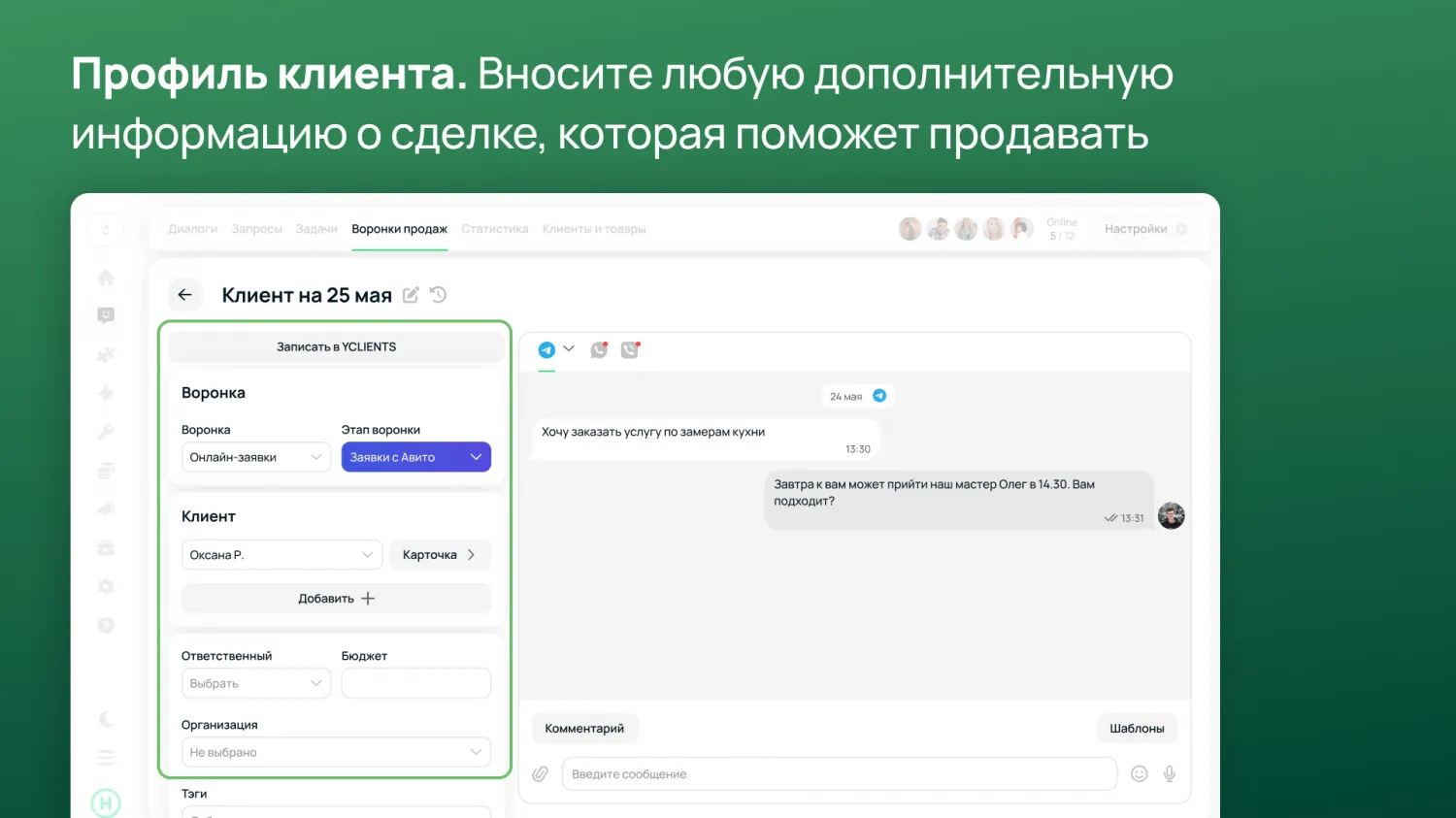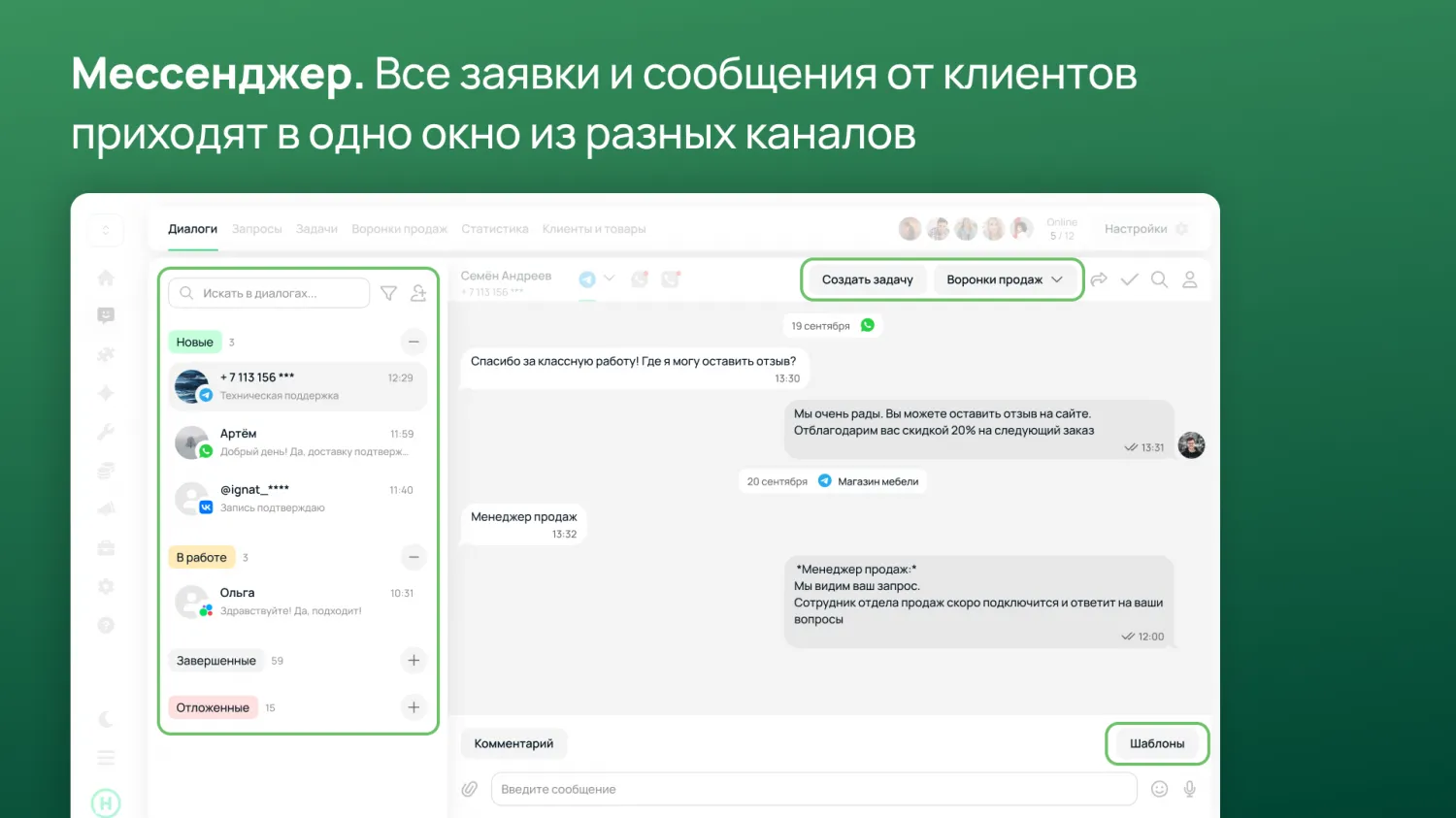- Корпоративный мессенджер для всех диалогов с клиентами — чтобы не пропускать заявки и быстрее отвечать на обращения;
