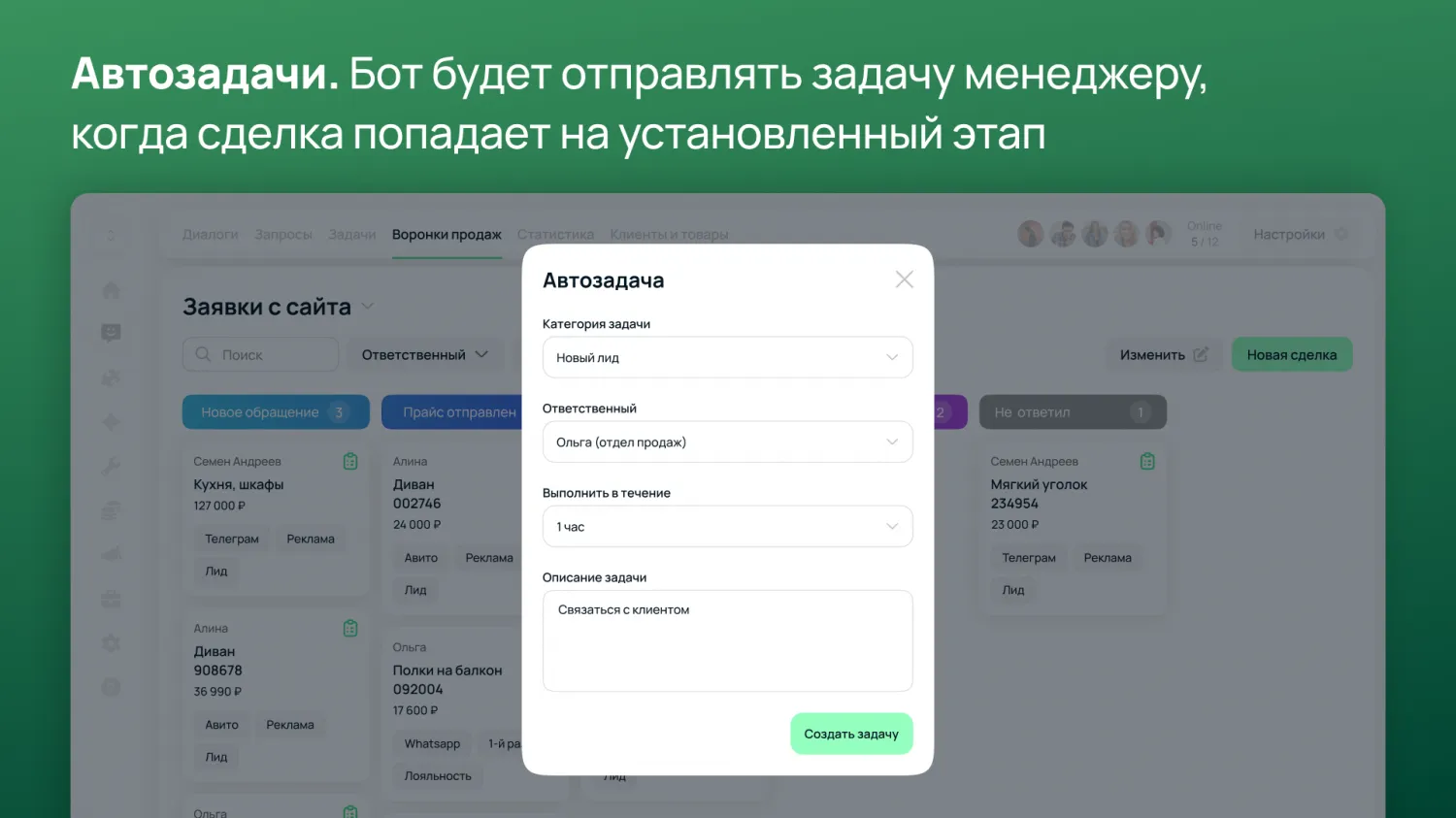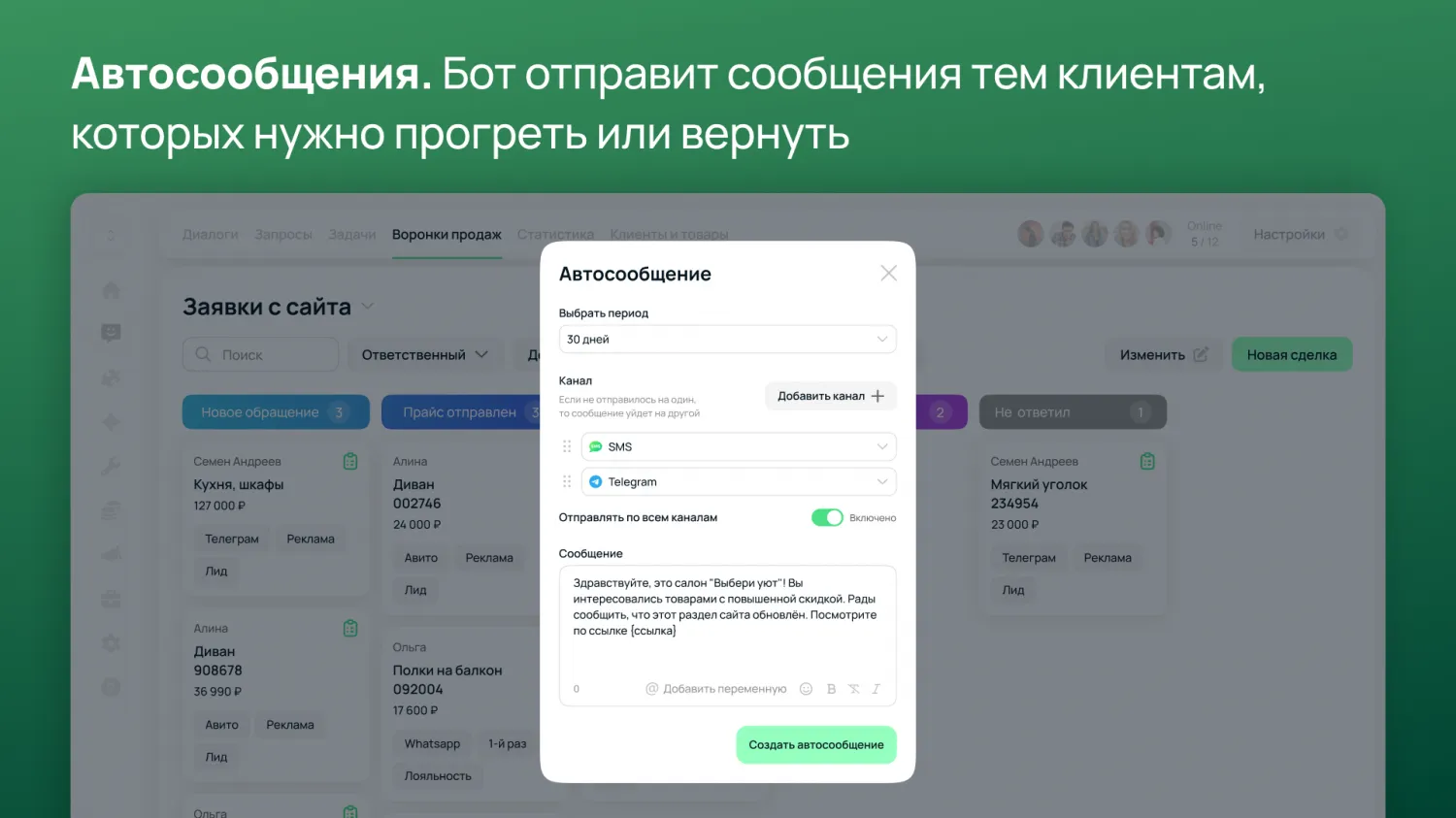 - Возвращать и прогревать клиента автоматически — это делает бот в зависимости от этапа воронки.