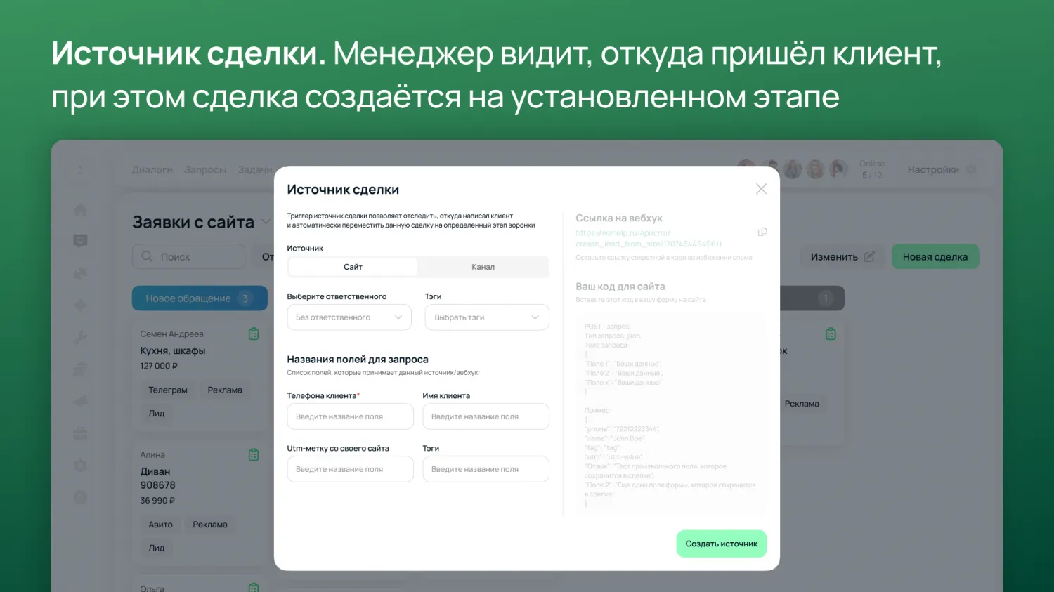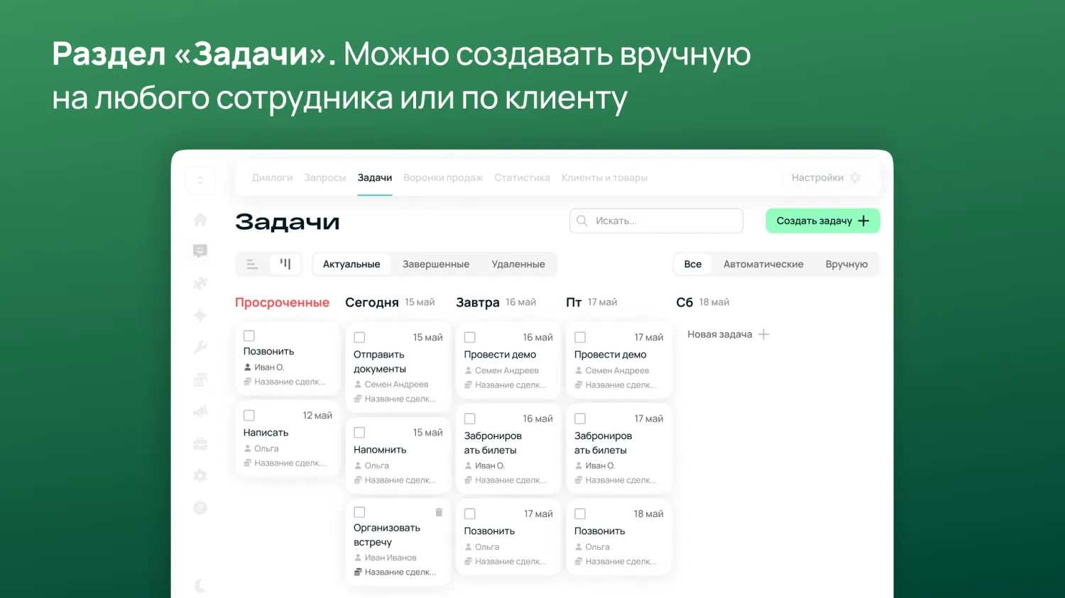 - Воронка продаж, сделки на каждого клиента с этапами — чтобы не терять лида в процессе;