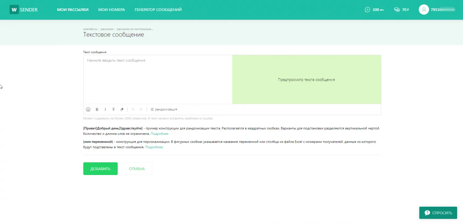 - Персонализация и рандомизация текста - Персонализируйте свои сообщения при помощи функционала WSender – обращайтесь к получателям по имени, предлагайте индивидуальные условия, делайте свои сообщения уникальными.
