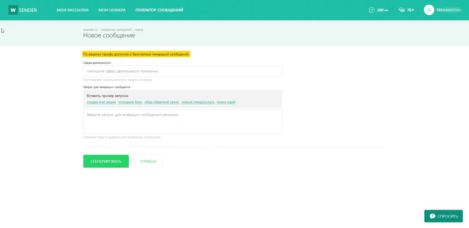 - Генератор сообщений - В сервисе есть встроенный генератор сообщений на основе искусственного интеллекта.
