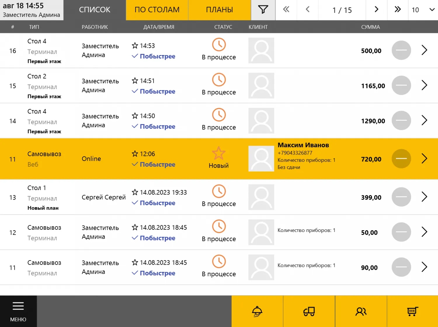 - Вести учёт, работать с заказами всех типов, в том числе с заказами из сервисов доставки еды.